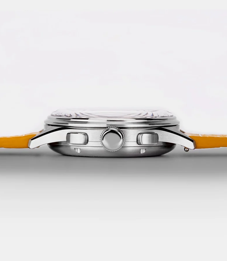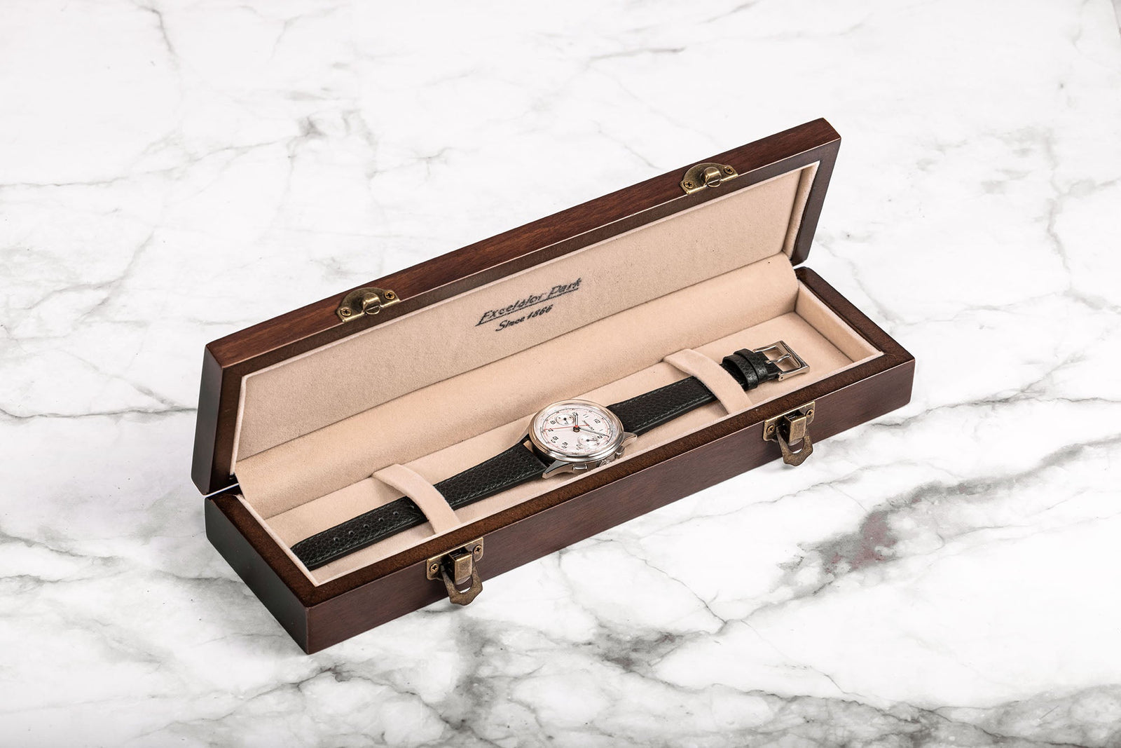 A classic of 1950s watchmaking, the EP95000 features a very legible white dial. It is covered with a double domed sapphire crystal with anti-reflective treatment. This manual winding chronograph  with two sub counters is equipped with a red telemeter and a blue tachymeter scale. Powered by the Swiss Sellita SW510 BH B movement, it is the epitome of quality and timelessness.